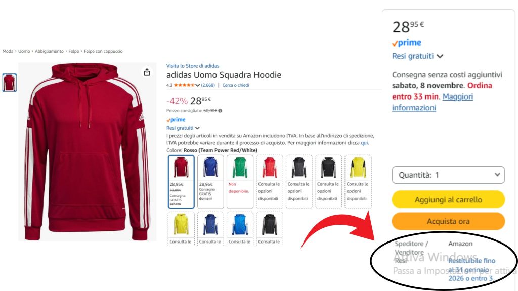 La restituzione è completamente gratuita, a condizione che si scelga un metodo di consegna approvato (es. punti di raccolta Amazon Hub o Poste Italiane).